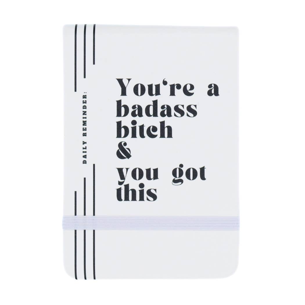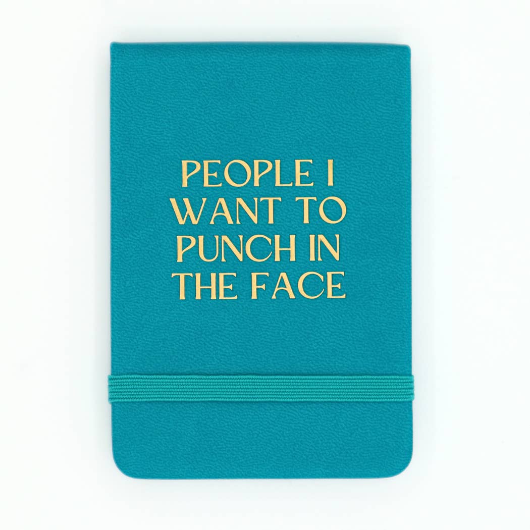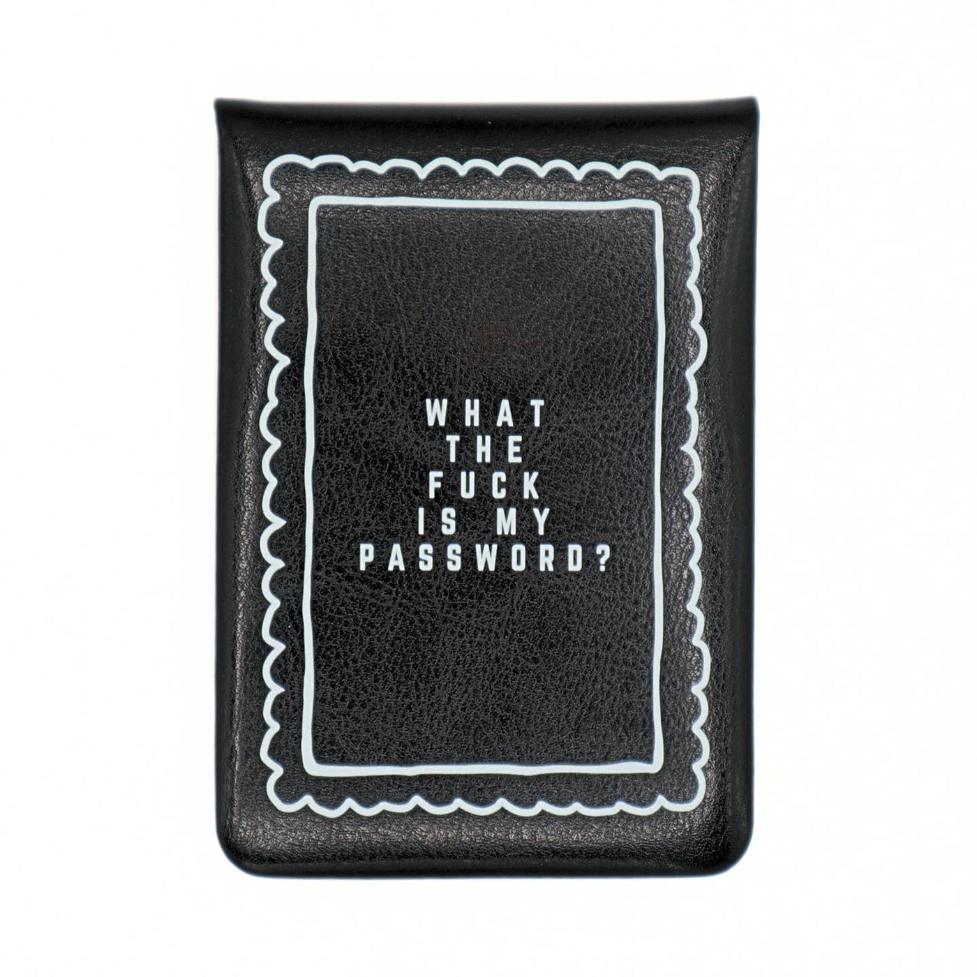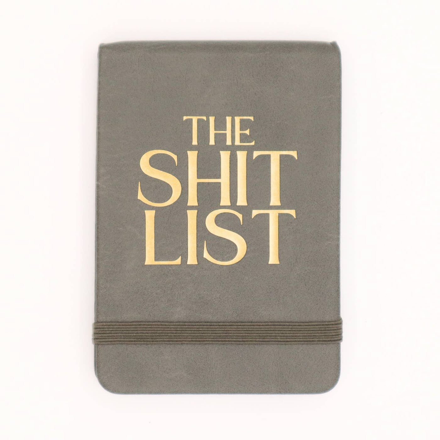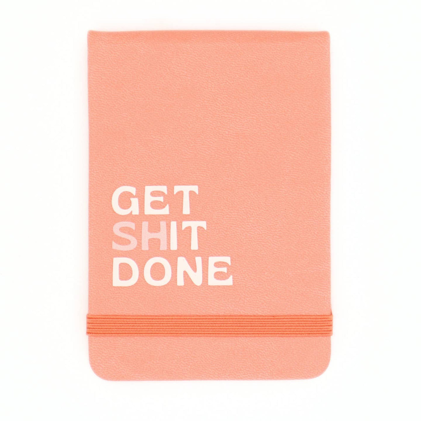 Made of a soft leatherette material and gold foil embossed. Half pages are lined and half are blank and it comes with an elastic band to bind the notebook closed.