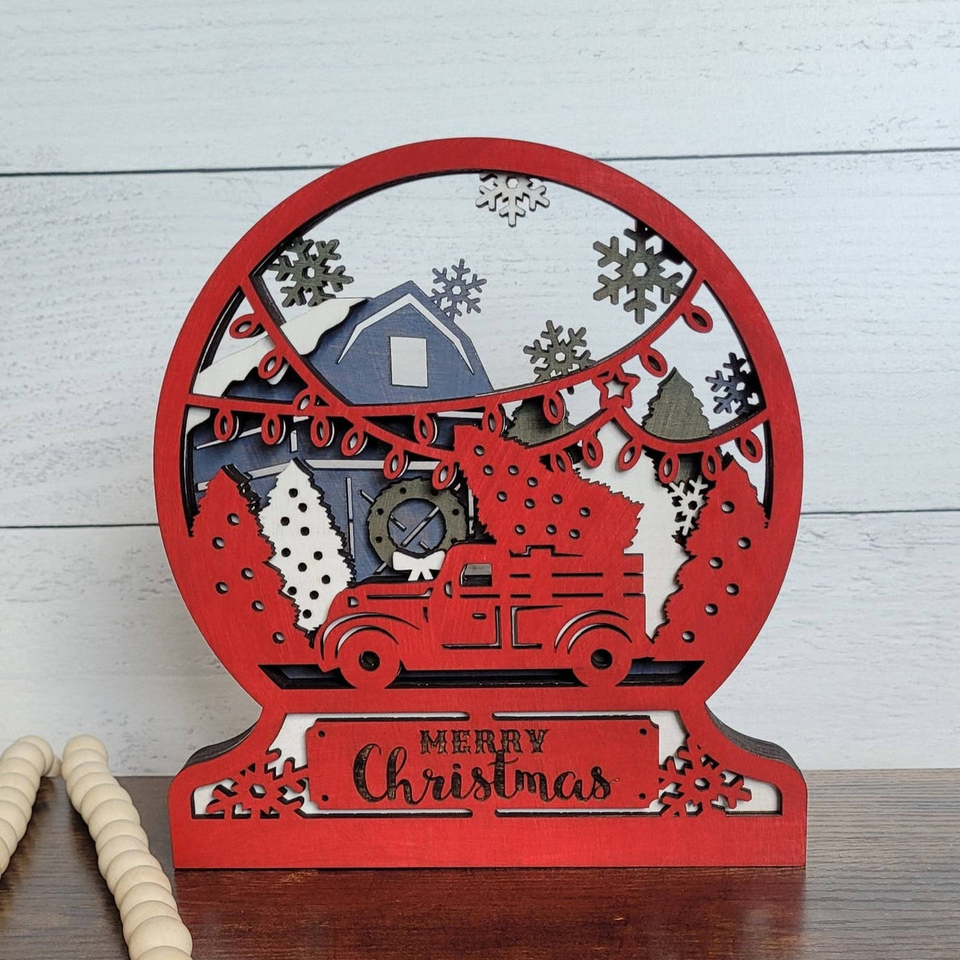 Bring the joy of the holiday season into your home with our handmade Christmas Truck Snowglobe. This intricate snowglobe features a beautiful farm scene with the classic Red Christmas truck encased in 4 layers of wood, adding a unique and timeless touch to your holiday decor