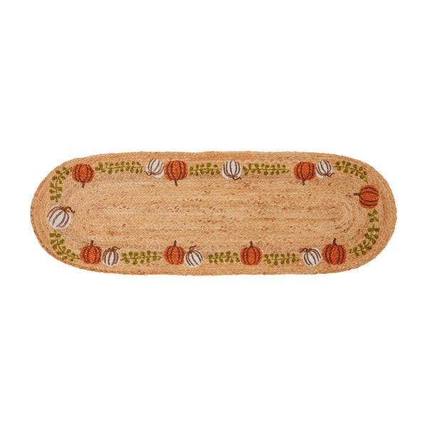 Add a touch of rustic charm to your table with this beautiful Pumpkin Runner. This table runner is made from braided jute, giving it a natural and earthy look. The runner features a pumpkin design, perfect for adding a festive touch to your fall or Thanksgiving table decor.