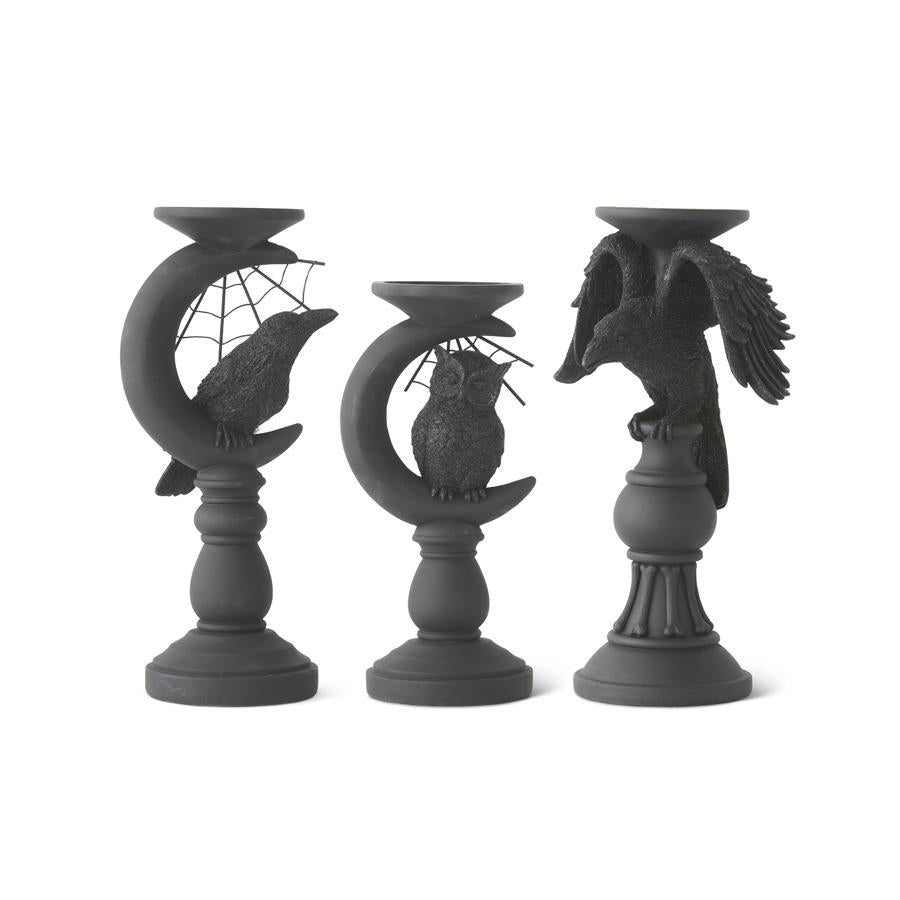 Bring a spooky vibe to your Halloween setup with K&K Interiors Matte Black Halloween Candleholders. Featuring an assorted trio of crow, owl, and vulture designs, these candleholders add a playful yet eerie touch to your decor. Perfect for casting flickering shadows and setting a mysterious mood at any Halloween gathering.