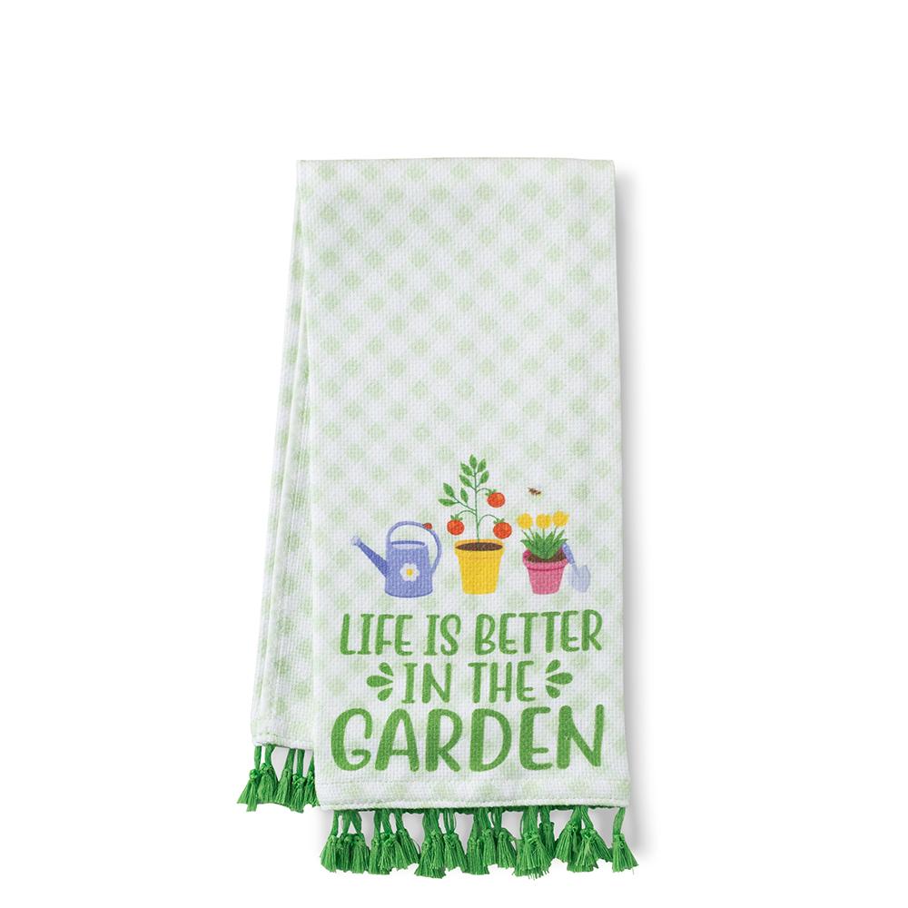 Give the perfect gift for any kitchen with this stylish tea towel! This cheerful garden print grows to life with a patchwork of vibrant blooms, watering cans, and charming garden tools, across a soft green gingham backdrop.