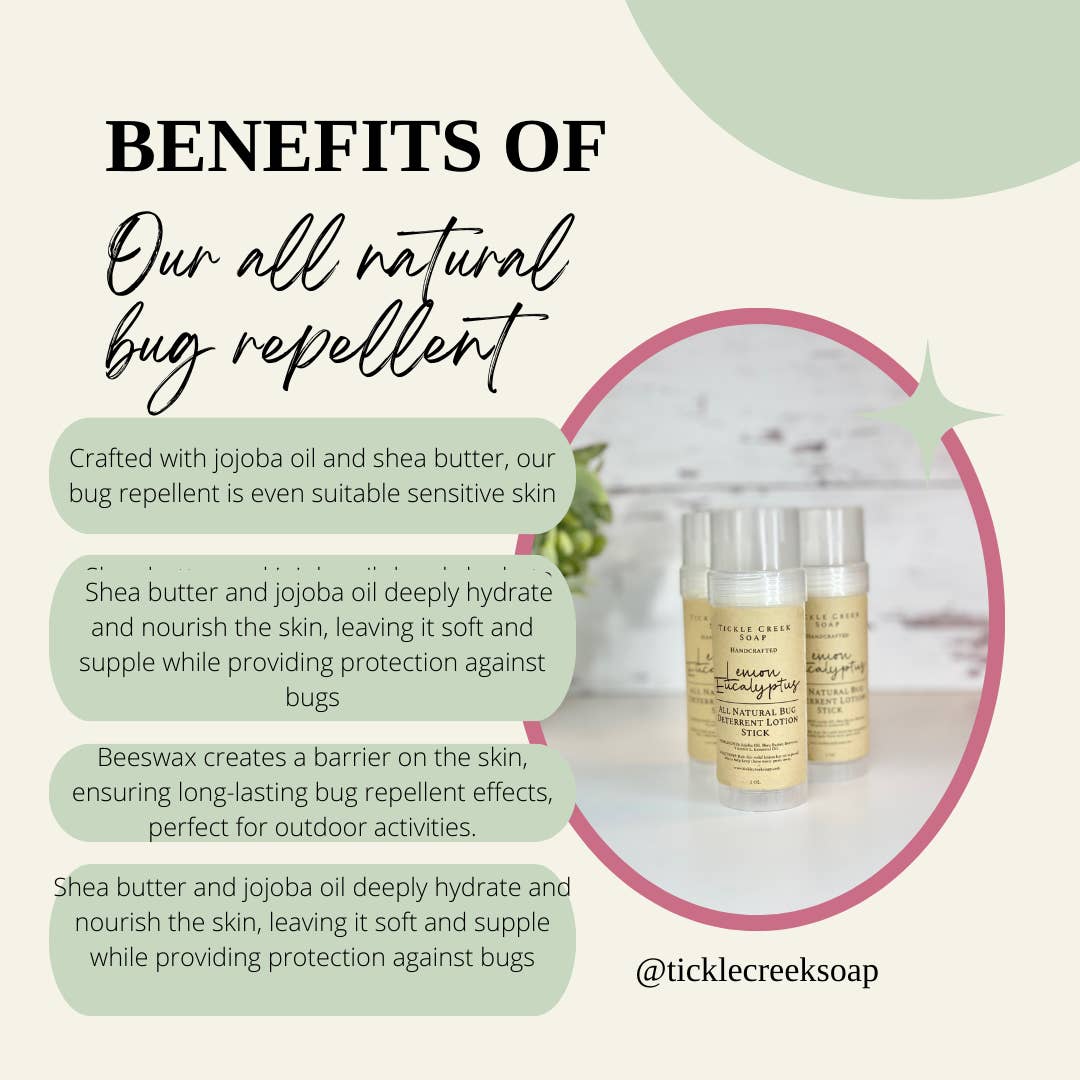 Introducing our all-natural bug repellent stick, expertly crafted with a blend of jojoba butter, shea butter, beeswax, vitamin E, and lemon eucalyptus essential oil. This solid lotion bar provides effective mosquito repellent properties in a convenient stick format, perfect for those seeking organic bug repellent solutions for sensitive skin.