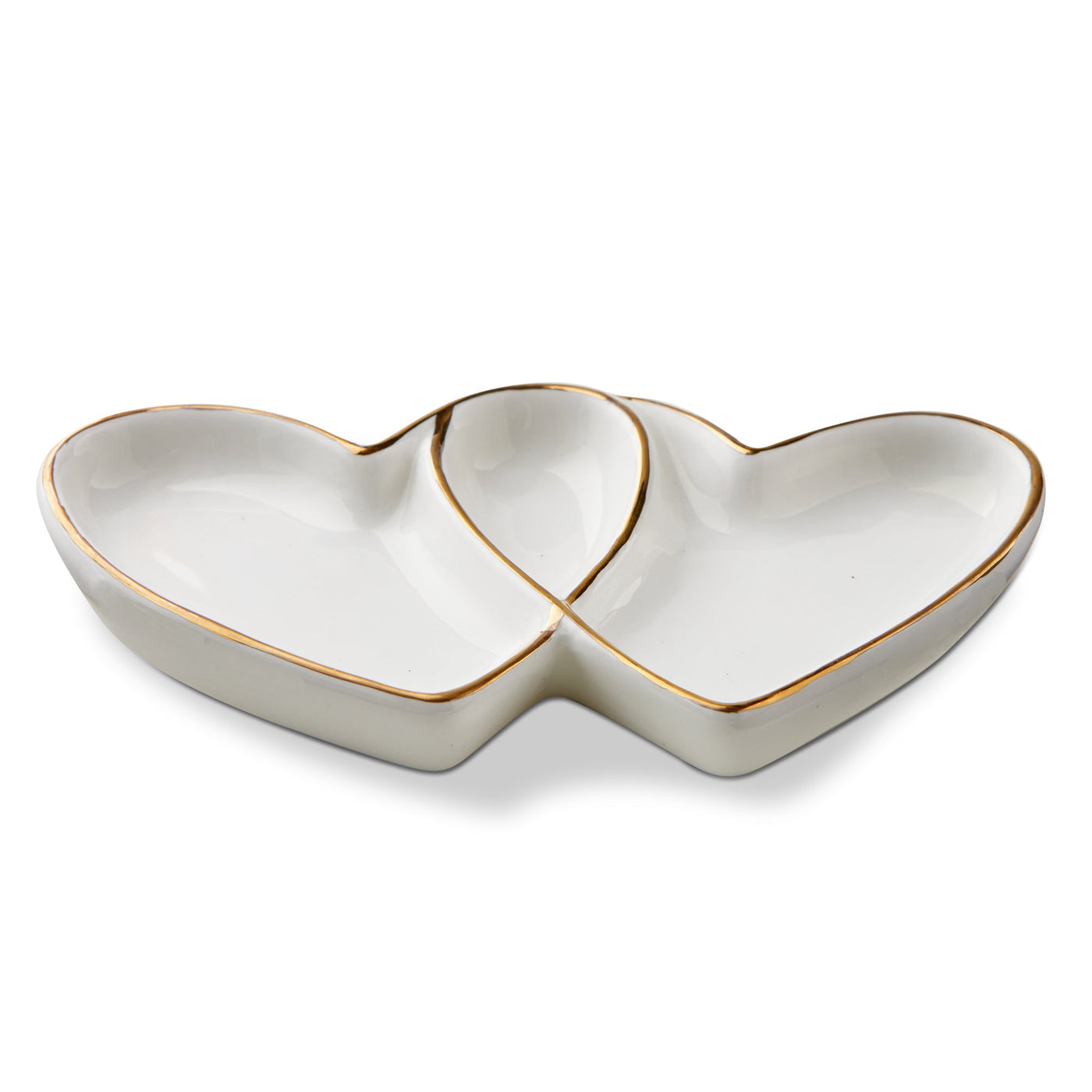 Sweetheart Trinket Dish features two linked ceramic hearts with soft curves. Keep rings and earrings bedside, use for place cards at a bridal shower, or add to a gift basket.