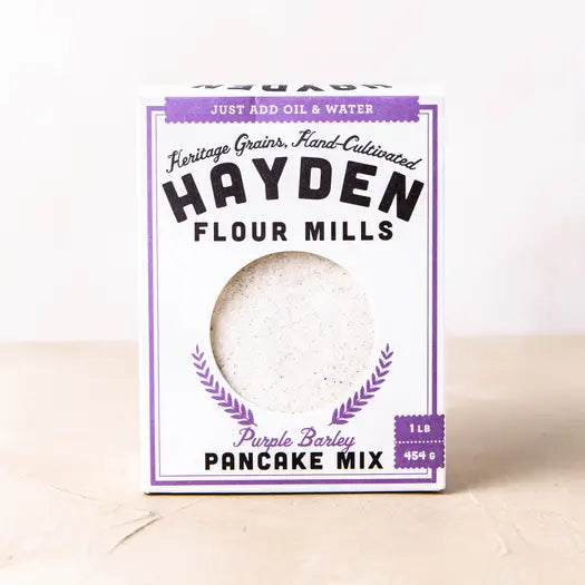 Purple Mix : For this special pancake mix, we blend our Purple Barley flour with White Sonora flour to make purple pancakes! These pancakes offer a deep, earthy flavor and delectable texture, not to mention a healthy dose of antioxidants. The simple “just add water & butter” pancake mix means you can go from box to breakfast in a matter of minutes. Start the day out bright with a pop of colorful pancakes that can’t help but put a smile on your face and a spring in your step.