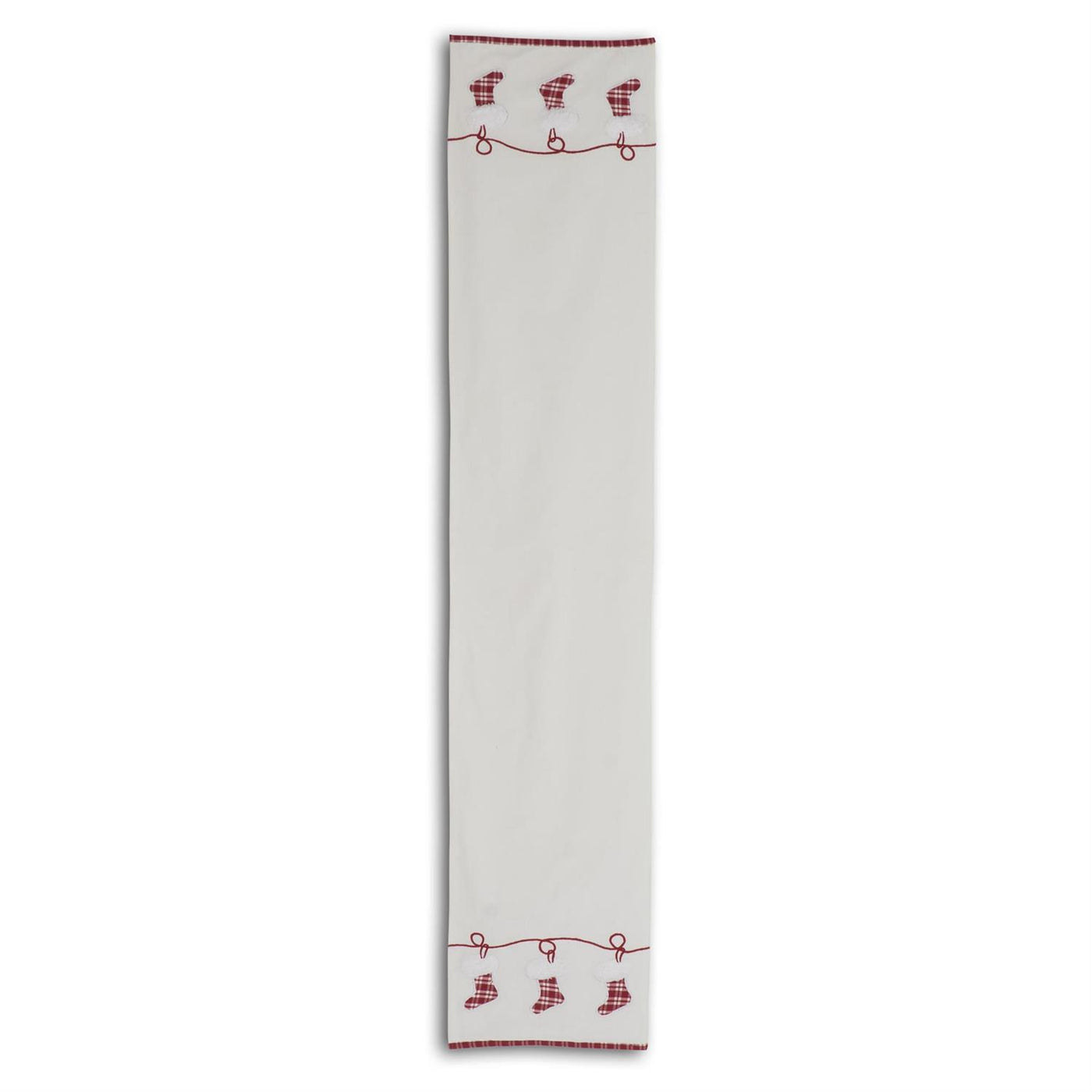 Elevate your holiday table with this refined 72-inch table runner from K&K Interiors. Crafted from premium white cotton, it features exquisitely embroidered Santa boots that capture the festive spirit with understated elegance. The contrasting red trim adds a polished finishing touch, perfectly complementing traditional or contemporary holiday décor. Ideal for dining tables, sideboards, or console surfaces, this versatile runner brings warmth and seasonal charm to any room while maintaining a sophisticated aesthetic throughout the holiday season.