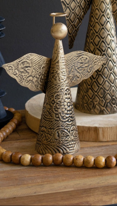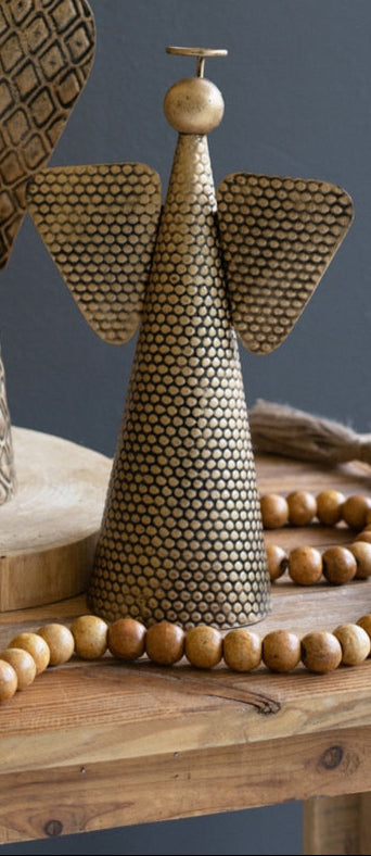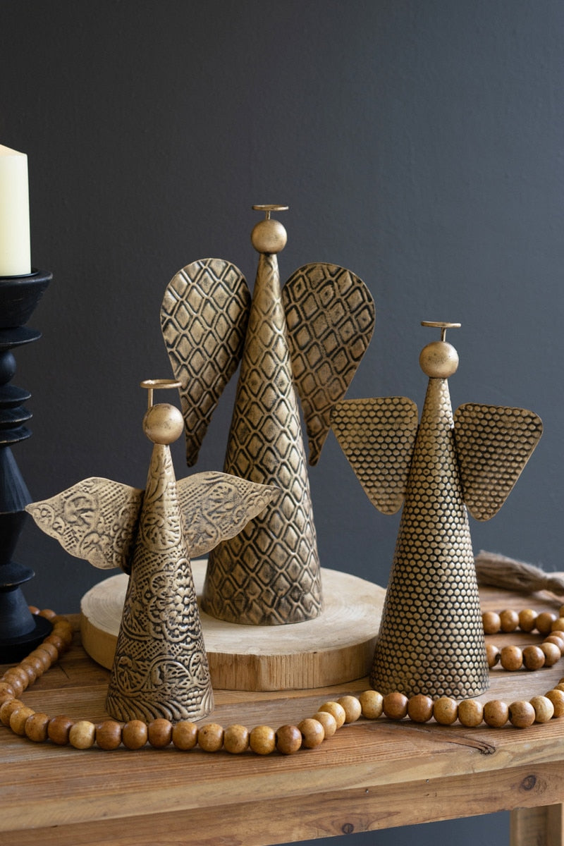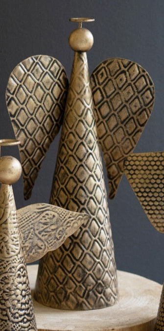 Use these antique gold angels for your tabletop display. Add these angels to your heavenly host collection or use it to begin your next arrangement. In three sizes, 17", 14", and 12" tall, and textured patterns this set is a unique find. Sold separately.